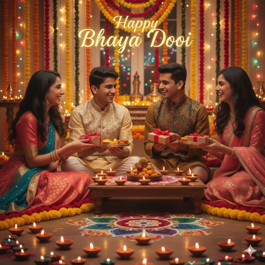 Siblings Gathered with Diyas and Marigolds for Joyful Bhaiya Dooj Portrait