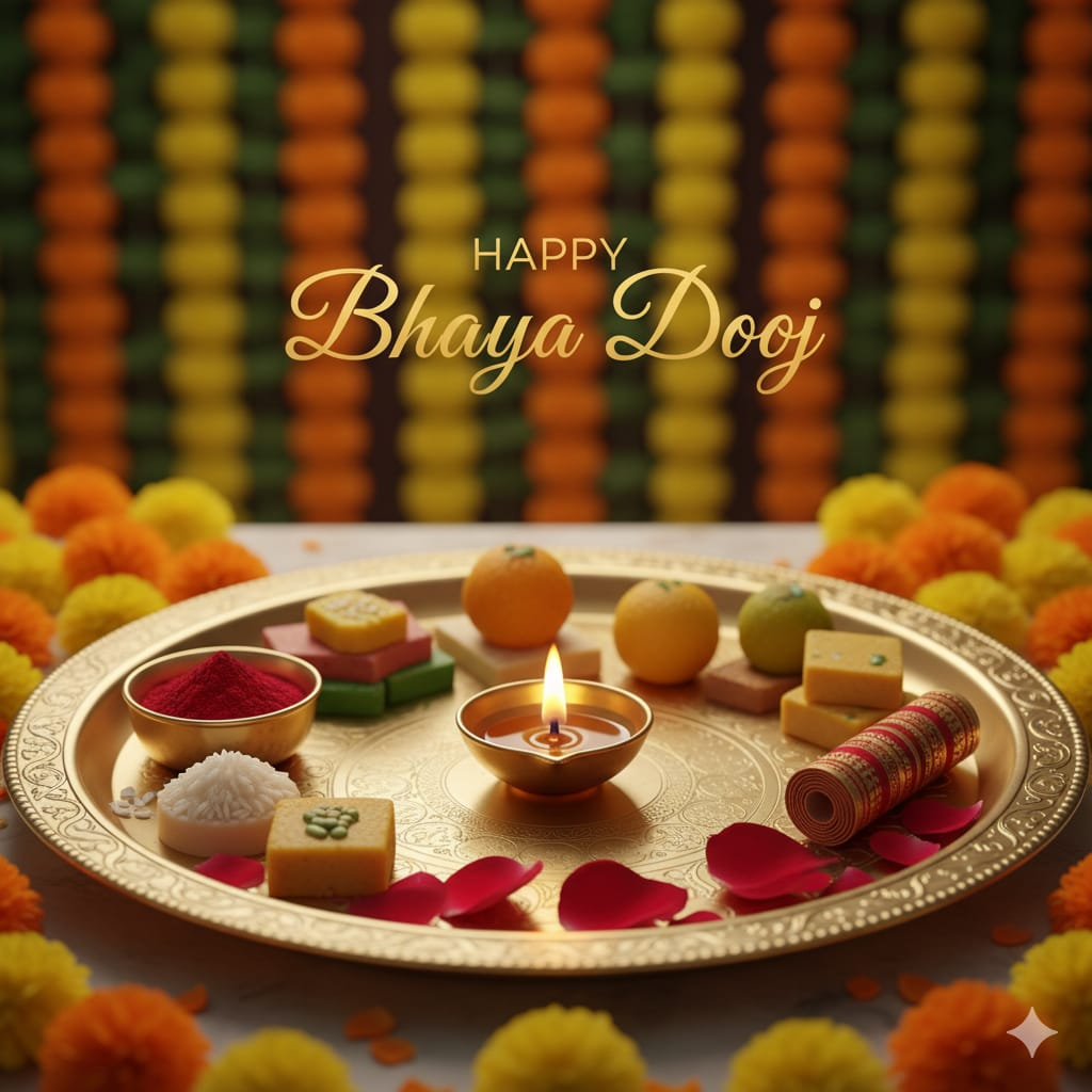 Decorated Thali with Vermilion and Diya for Traditional Bhaiya Dooj Ritual