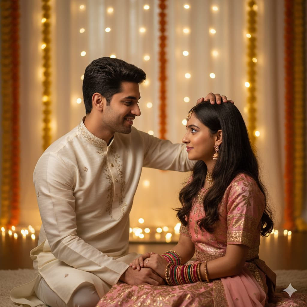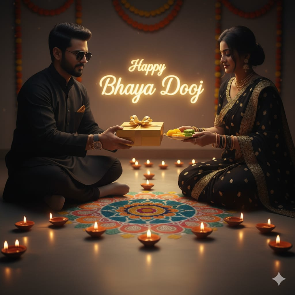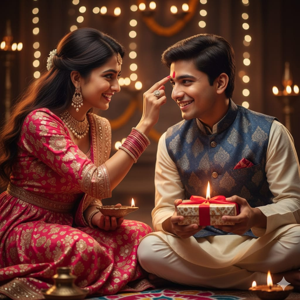 Brother Blesses Sister in Ethnic Attire on Bhaiya Dooj with Fairy Lights