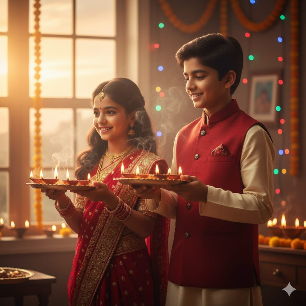 Brother and Sister Perform Aarti with Diya Trays in Golden Hour Light