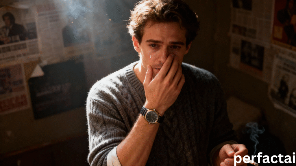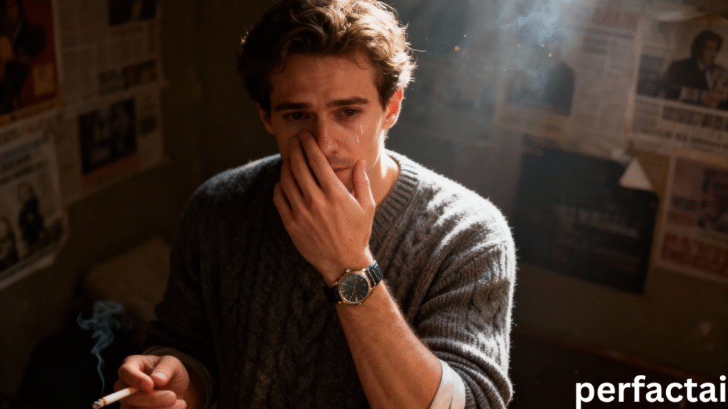 Hyper-realistic 4:5 overhead close-up of a 26-30 y/o man in a dark room, wiping a tear in one hand while holding a lit cigar in the other. His head is bowed but eyes still locked on the camera. Wears a cable-knit sweater, watch. A battered wall with posters behind, faint sunbeams through a roof window cast dramatic light. Sharp focus, creamy bokeh, moody color grading, 8K gritty emotion”